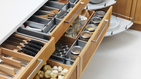 廚房里總有一些拐角讓人心煩,但其實只要設計得當,也能成為收納好幫手。比如櫥柜的拐角處儲藏空間很大,常常被忽略,因為里面太深了。對于這種空間可以安裝一些“小怪物”,也就是旋轉型的櫥柜五金,把里面的東西旋轉出來,這樣就不會浪費任何死角了。