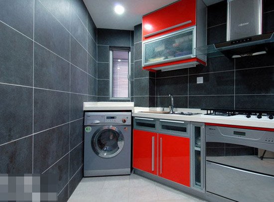 不管怎樣,買到這樣的戶型,再難受也得忍著裝修完。這塊空間是一個廚房,櫥柜并沒有一直設計到頭,因為那樣使用起來很不方便,那多出的角落空間怎么辦呢?看著剛好的尺寸,簡直就是為洗衣機量身定制的,放上一個小巧的滾筒洗衣機簡直不要太棒。在洗衣機上方再設置一個擱物架,一點空間也不浪費。