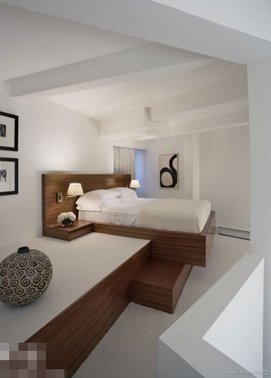 不過,幸好有設計師在,把床架抬高然后靠墻往里放置,給人一種安穩厚實的感覺,在扭曲的空間里多了些安全感。屋子空間一頭寬一頭窄,設計師通過與床相連接的床頭柜和坐塌,完美地利用了房屋空間。天花板上的直線條賦予室內更多變化。