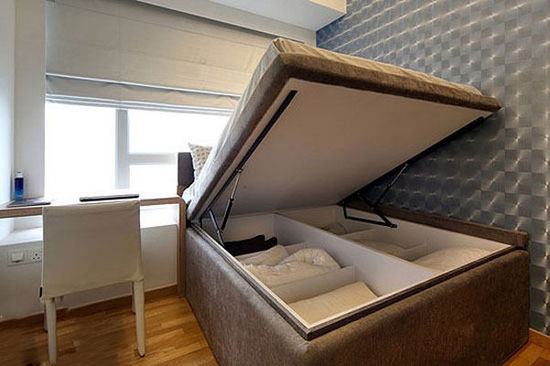 現在有那種開合式的床,可以將床體內部空間利用起來。到了換季的時候,把應季的衣服飾品找出來,然后把春天的厚衣服、厚被子等整理好,塞到床體空間里。等到需要的時候再重新拿出來,不僅節省空間。還具有很好的隱蔽性。