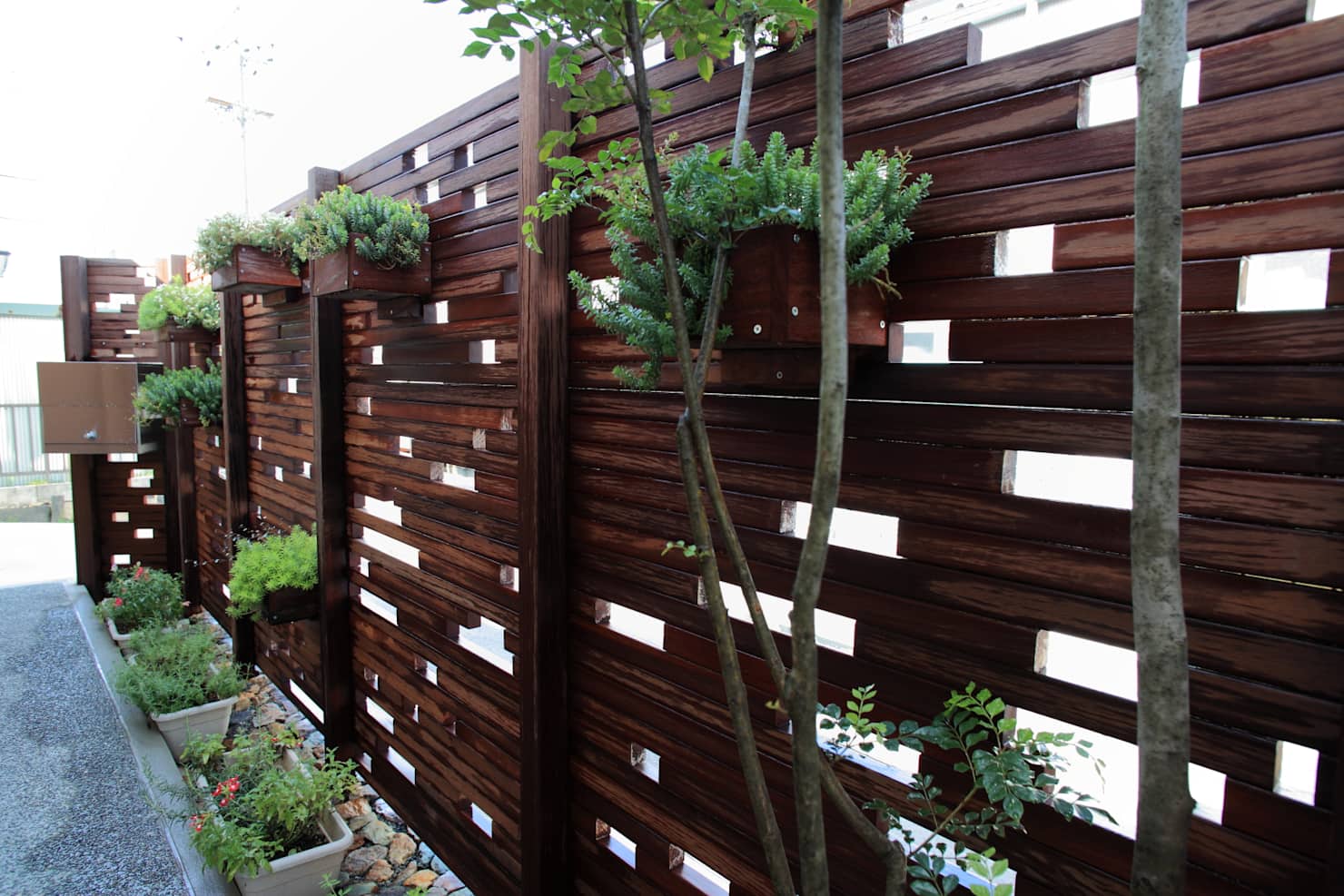 又是一經(jīng)典款的別墅庭院裝修圍欄設(shè)計,暖色調(diào)的木板拼接在一起,每塊木板的寬度都不一樣,構(gòu)成一座簡單又有些別致的圍欄。