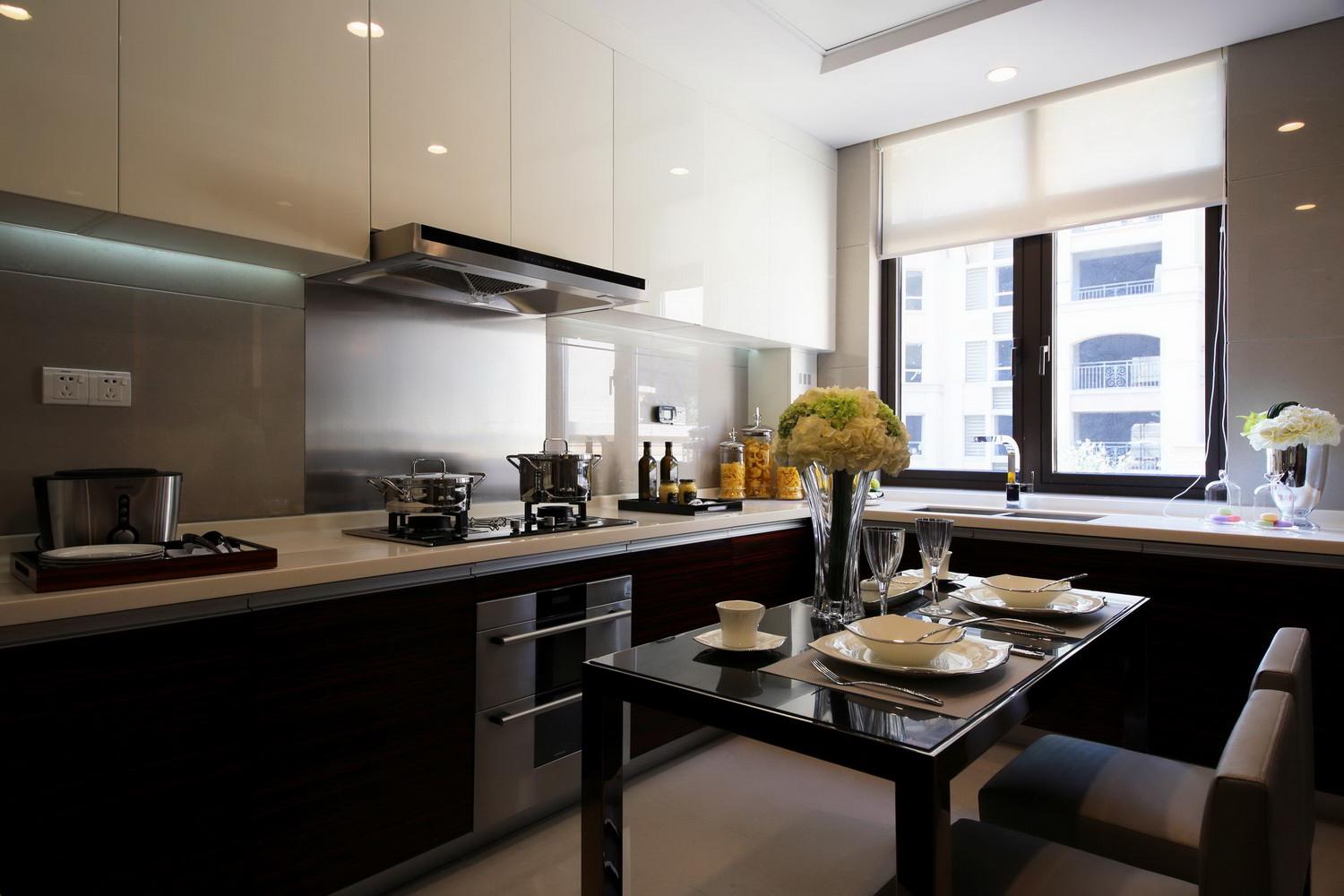 港式廚房給人的感覺現代,功能強,多以金屬色澤體現港式廚房的特色。色彩線條簡單的餐桌椅,整體色彩以灰白色系為主。